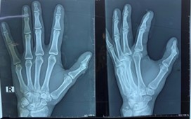 Fig.1: Preoperative radiograph showing intra-articular fracture of the distal phalanx at the thumb IP joint.