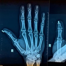 A 30-year-old right-hand-dominant male presented to the emergency department with a traumatic injury to the right thumb following an angle grinder accident. Examination revealed a deep laceration over the dorsal IP joint and complete loss of active extension. Radiographs confirmed an intra-articular fracture of the distal phalanx involving the IP joint, with minimal displacement and no subluxation.