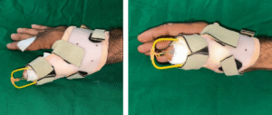 The concept of dynamic or static traction using external devices has been successfully applied in metacarpal and phalangeal fractures (Schuind et al., 1988). In that study, a triangular external fixator provided prolonged traction, preserving articular congruity while minimizing soft tissue disturbance. Similarly, the present case employed tension-based alignment without invasive fixation, representing a potential extrapolation of external traction principles into non-invasive thumb IP management.